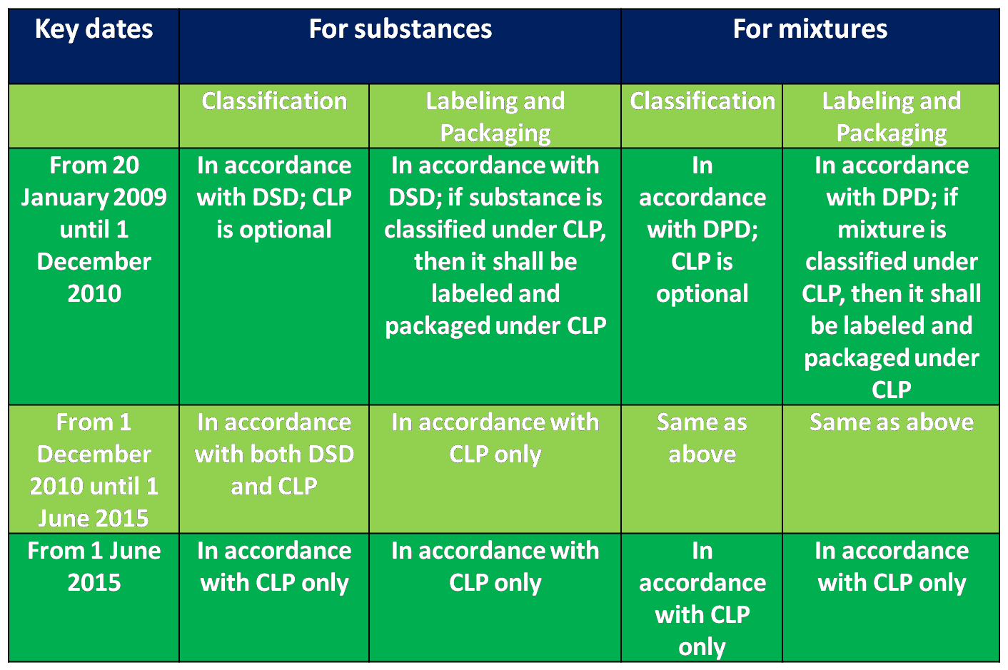 The CLP Regulation will replace Dangerous Substances Directive 67/548/EEC (DSD) and Dangerous Preparations Directive 1999/45/EC (DPD) in a stepwise approach during a transitional period. On 1 June 2015, both directives will be fully repealed.